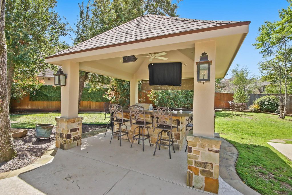 | Exterior: | Roof: Composition Foundation: Slab Private Pool: Yes Private Pool Desc: Gunite,In Ground Exterior Type: Brick, Stone, Stucco Lot Description: Cul-De-Sac, On Golf Course, Subdivision Lot Garage Carport: Auto Garage Door Opener Water Sewer: Public Sewer, Water District Area Pool: Yes Exterior: Back Yard Fenced, Exterior Gas Connection, Outdoor Kitchen, Patio/Deck, Sprinkler System, Subdivision Tennis Court |